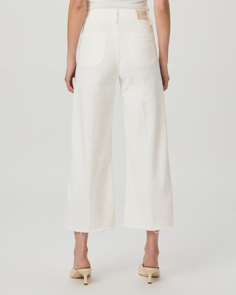 Anessa is Paige's modern high-waisted wide leg with a slightly relaxed fit and an ankle-length silhouette for an effortlessly chic look. Crafted from comfort stretch denim with plenty of coverage and the perfect amount of stretch, this pair comes in Tonal Ecru with welt utility pockets and a raw hem.