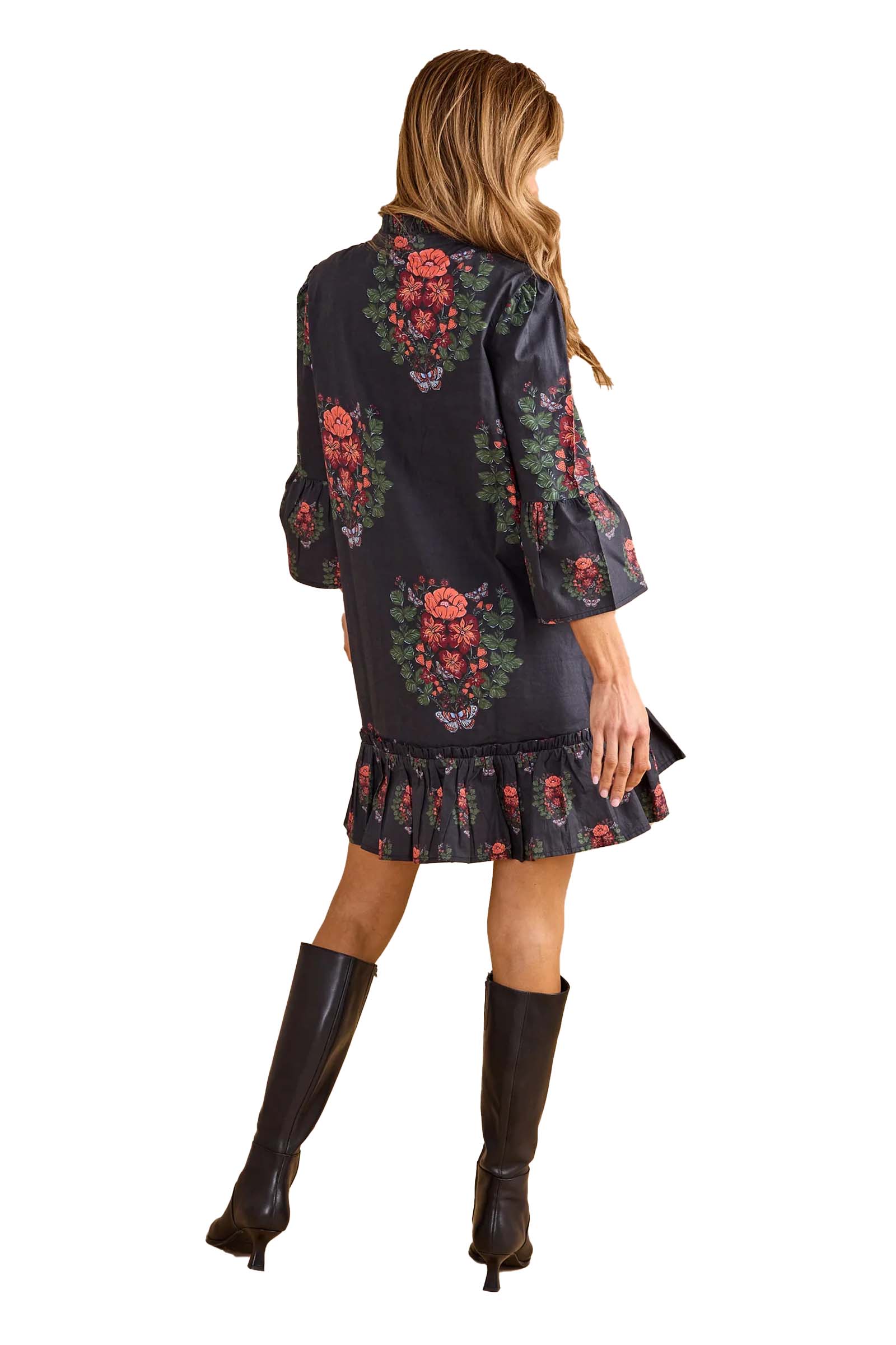 Create romantic drama in this charcoal dress featuring a stunning terrace print of coral and green florals. The high neckline with button detail and bell sleeves add vintage-inspired charm while the ruffled hem brings playful movement. Perfect with knee-high boots for fall sophistication.