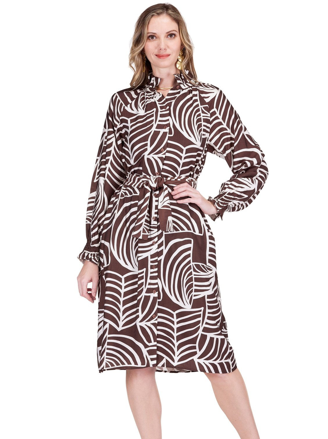 Embrace botanical elegance with the Jade gathers neck midi dress in striking brown ferns print, where nature-inspired motifs meet sophisticated gathered neckline detailing for refined organic appeal.
