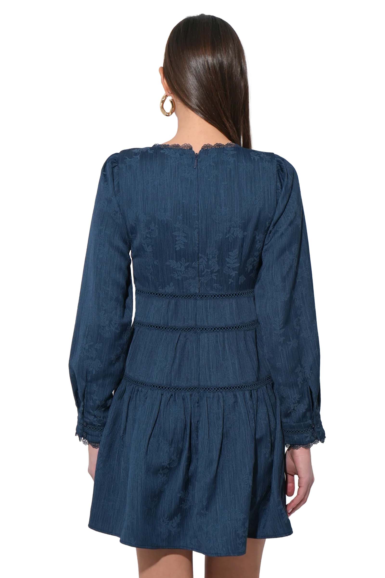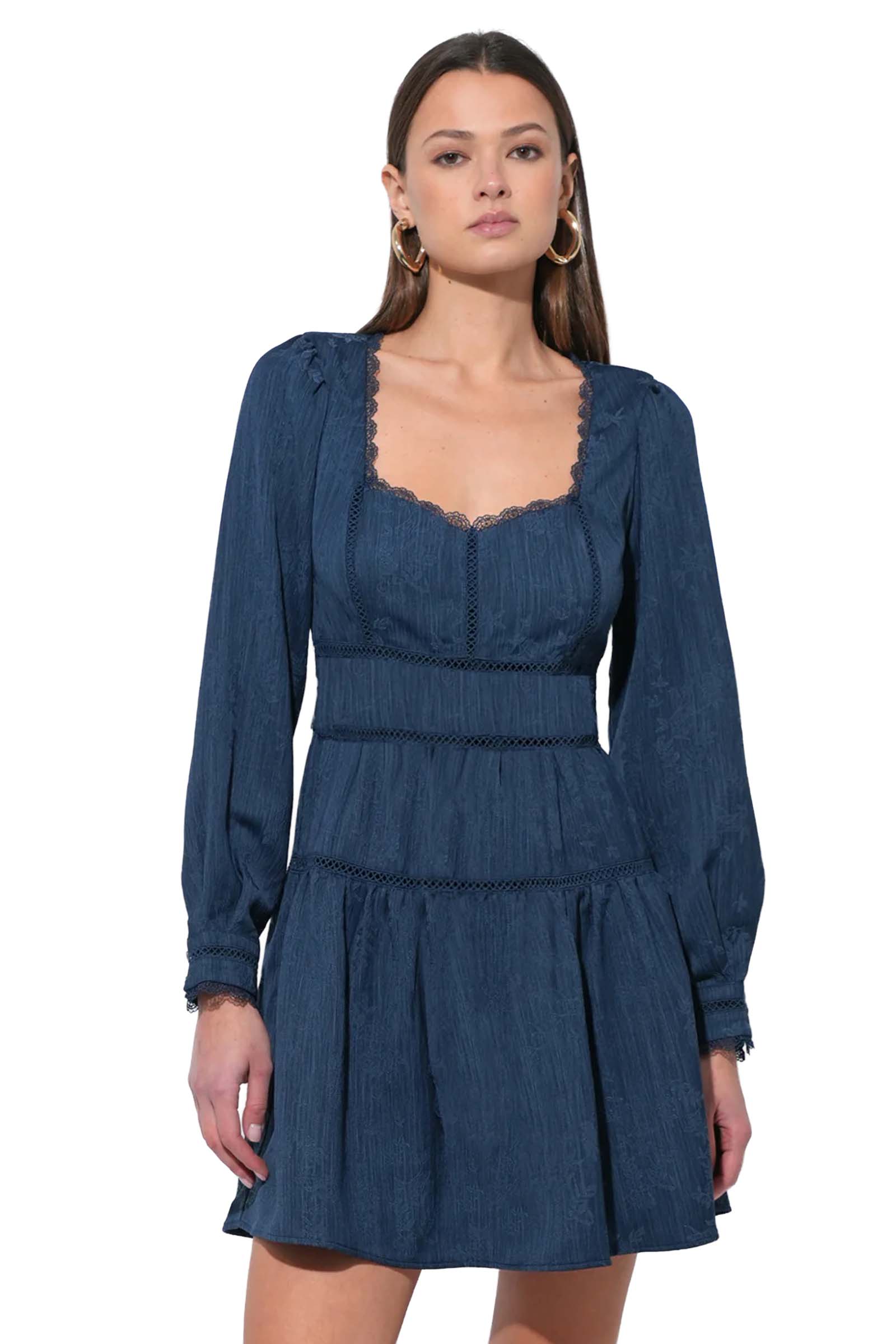 The Adelyn Rae Twilla mini dress in deep navy, where a flattering sweetheart neckline meets delicate lace trim detailing for timeless feminine appeal.