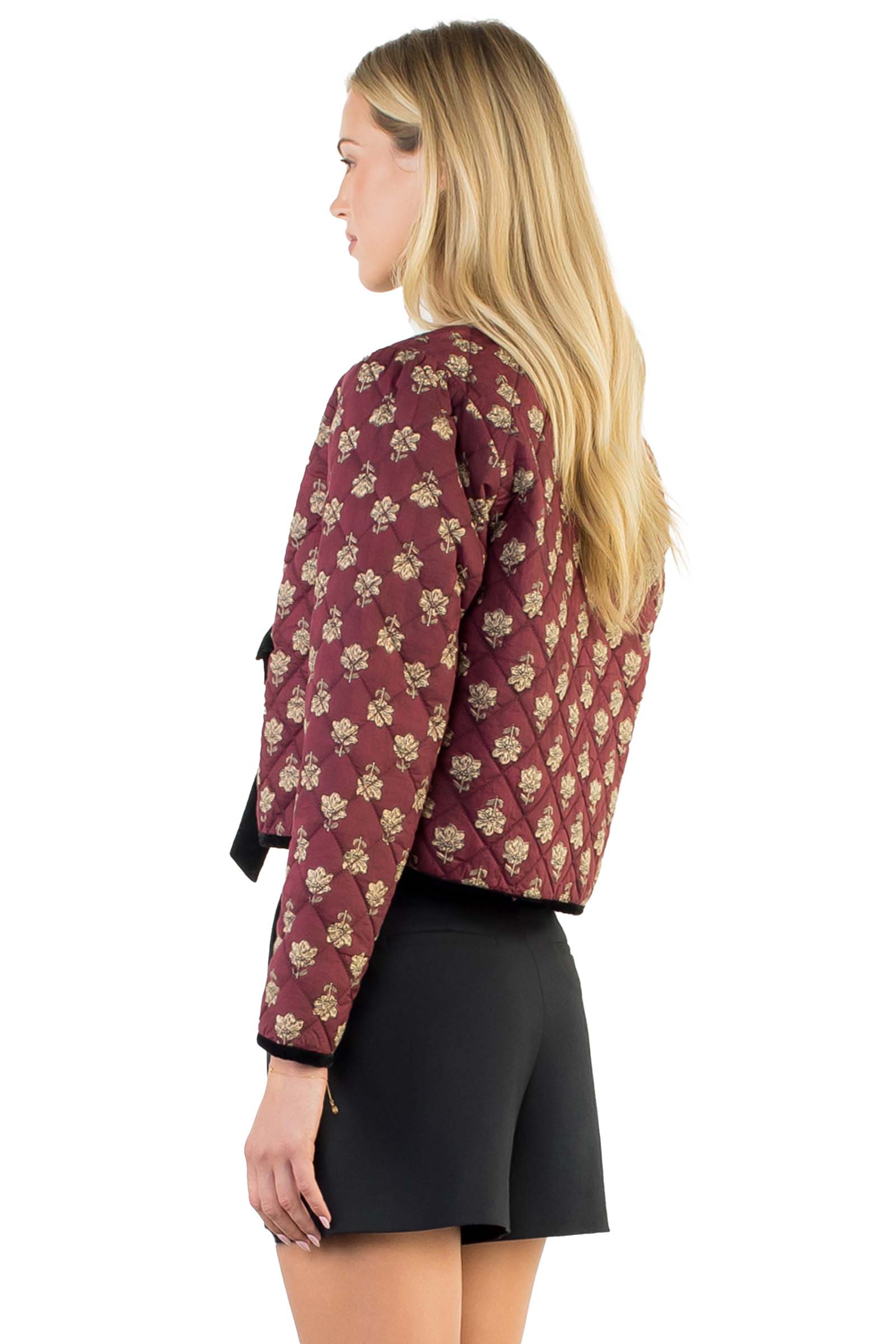 Add vintage-inspired elegance to any outfit with this sophisticated maroon jacket featuring a delicate beige floral print and luxe velvet bow tie. The cropped silhouette with black velvet trim creates timeless appeal perfect for special occasions. Layer over little black dresses for holiday parties or style with silk blouses and tailored trousers for polished daytime sophistication.