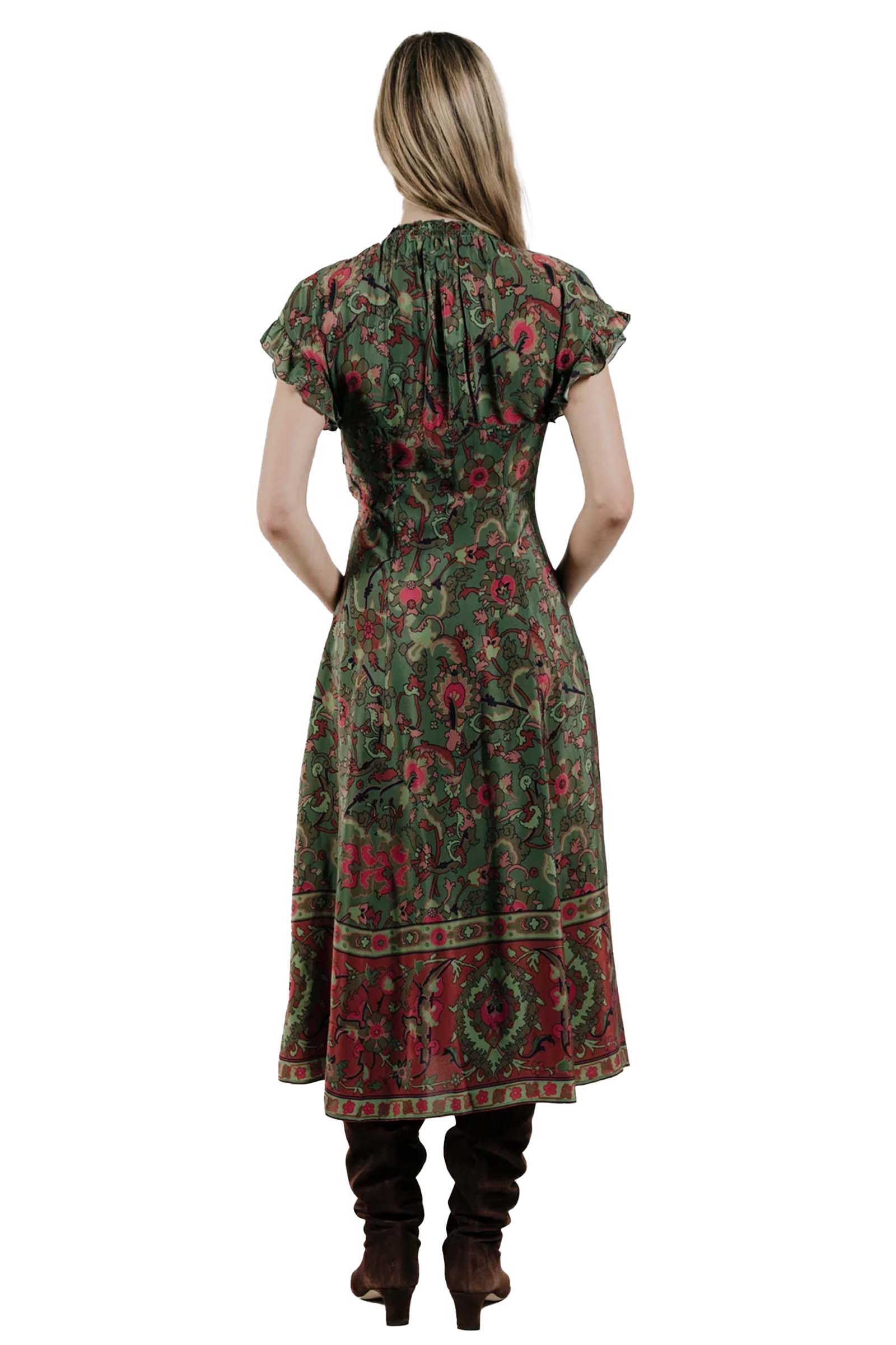 Step into romantic bohemian elegance with this enchanting midi dress featuring a rich Helena print of red florals on deep green. The gathered neckline with tie detail and flutter sleeves create feminine charm while the tiered skirt adds graceful movement. Perfect with knee-high boots for fall sophistication or strappy sandals for garden party glamour.