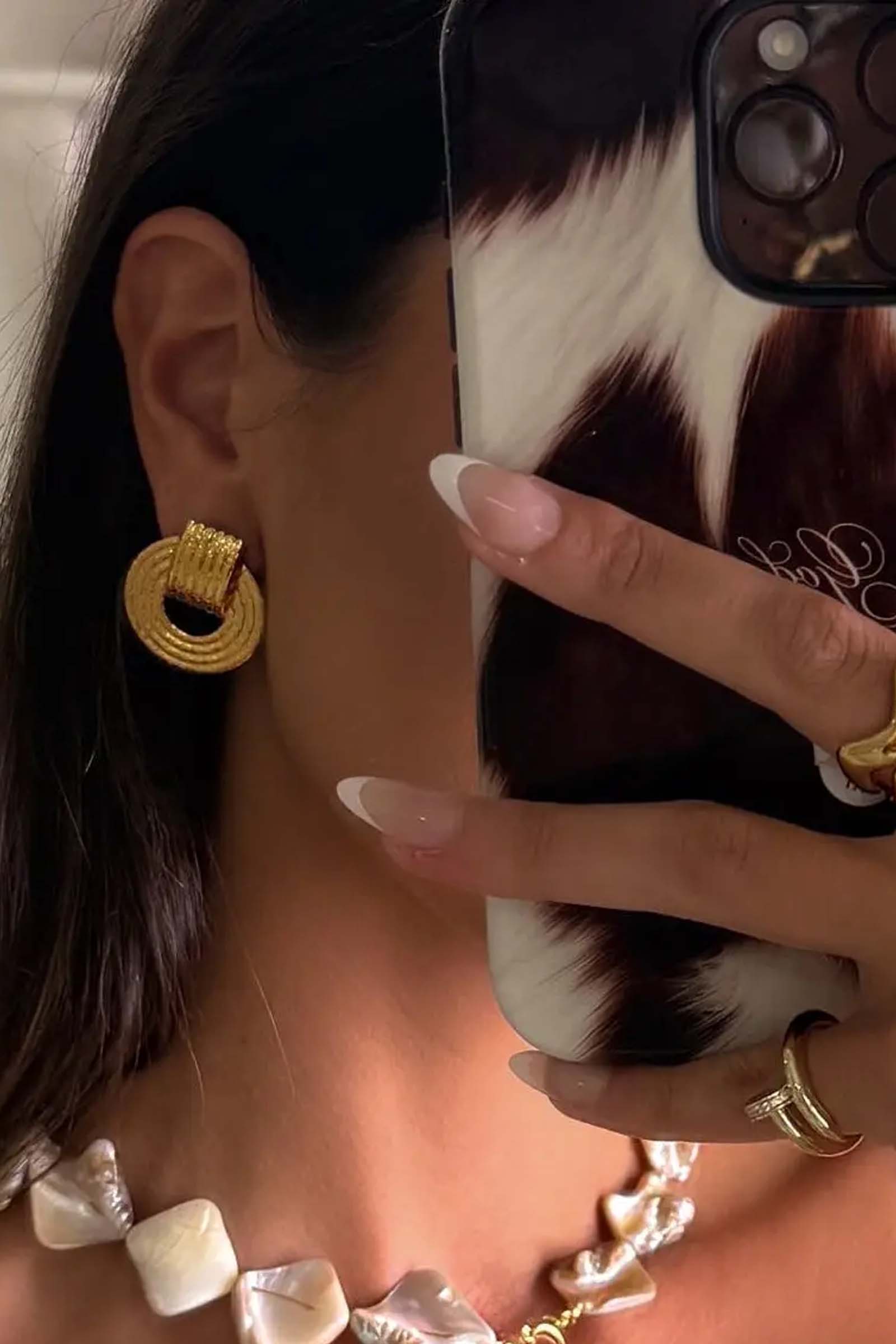 Meet the Carmela Doorknocker Earrings — bold, sculptural, and effortlessly chic. Their vintage-inspired silhouette and rich, ribbed texture create a striking statement that still feels timeless and refined. Dress them up or wear them with your everyday favorites for an instant touch of luxe.