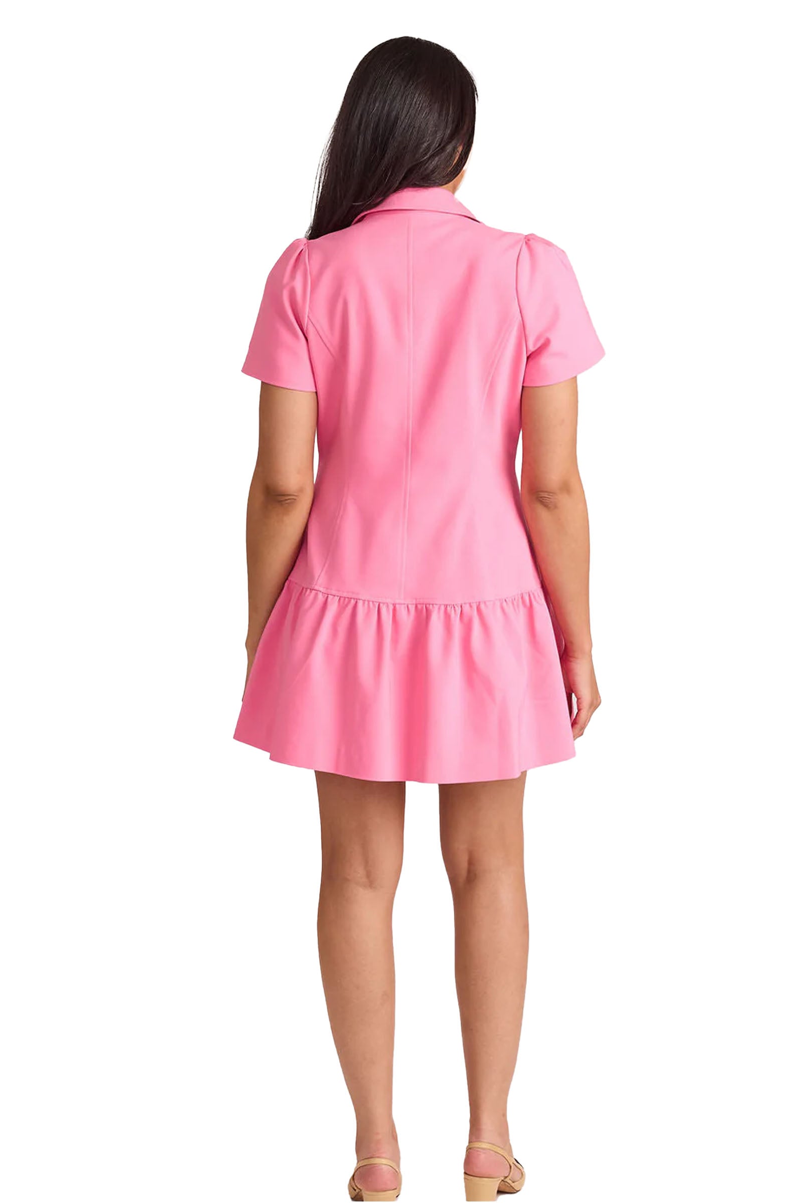 Polished meets playful in the Diana Dress in Pink Punch by S'edge. This blazer-inspired mini features a tailored double-breasted bodice with structured lapels and gleaming gold buttons that add a touch of sophistication. Short sleeves and soft shoulder pleating create a feminine balance to the sharp tailoring, while the drop-waist ruffle hem brings movement and a flirty twist to the silhouette. Finished in a vibrant pink hue, the Diana Dress is a standout choice for parties, luncheons, or any occasion where bold style is a must.