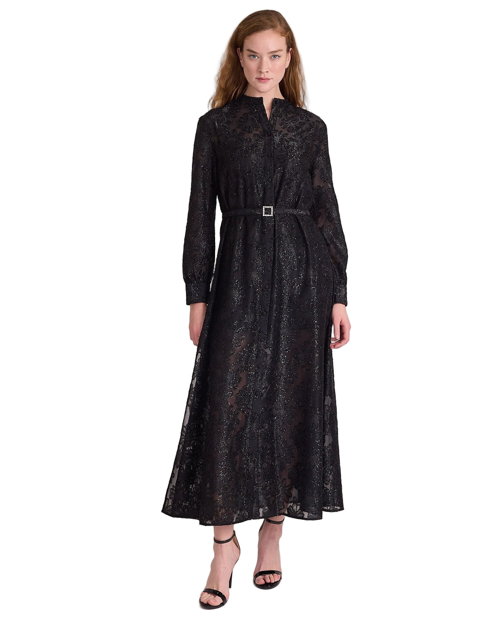 The Fiona Dress in Onyx Floral by Thomas & Lourdes is an elegant statement piece with a touch of romance. Crafted from sheer black fabric with a subtle metallic floral motif, this maxi dress drapes beautifully for a graceful silhouette. The design features a refined band collar, button-down front, and long sleeves with cuff detailing. A detachable belt with a jeweled buckle cinches the waist, adding just the right amount of sparkle. Perfect for evening soirées or formal occasions, this dress blends timeless sophistication with modern allure.