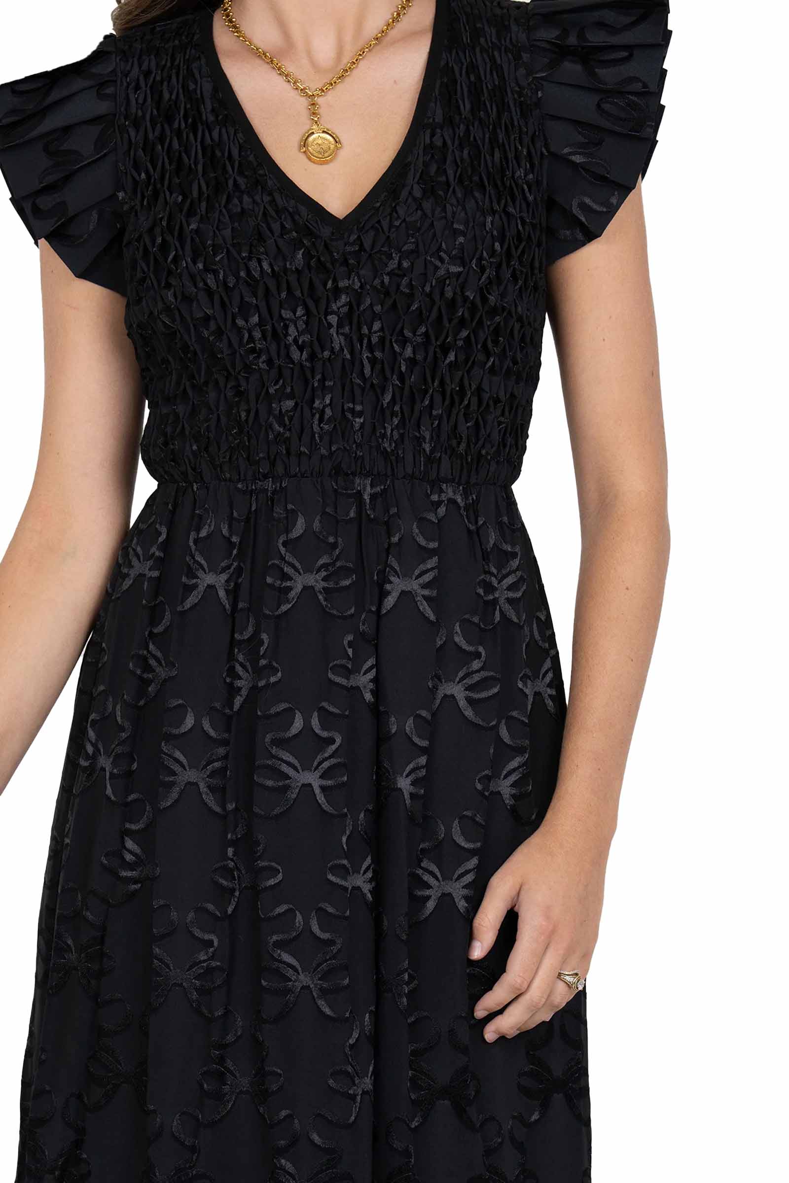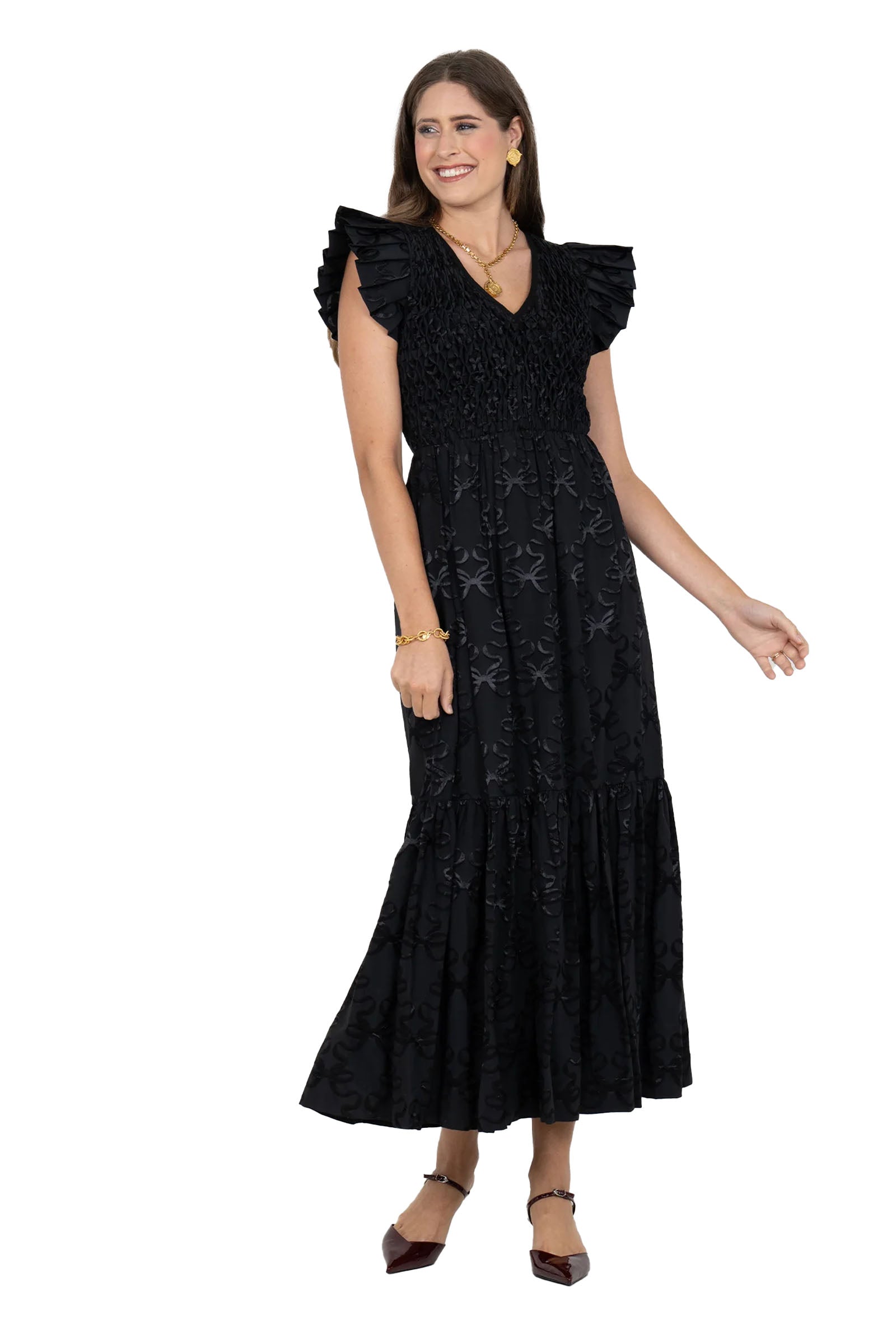 The Grace Dress in Bow by Emily McCarthy is a show-stopping blend of elegance and playful detail. Crafted in a rich black jacquard with a tonal bow motif, this maxi dress features a beautifully smocked bodice that flatters the waist and bust. The V-neckline and dramatic pleated flutter sleeves add a touch of sophistication and modern flair, while the tiered skirt flows with effortless movement. Perfect for evening occasions or elevated daytime events, the Grace Dress strikes the balance between timeless romance and contemporary style.
