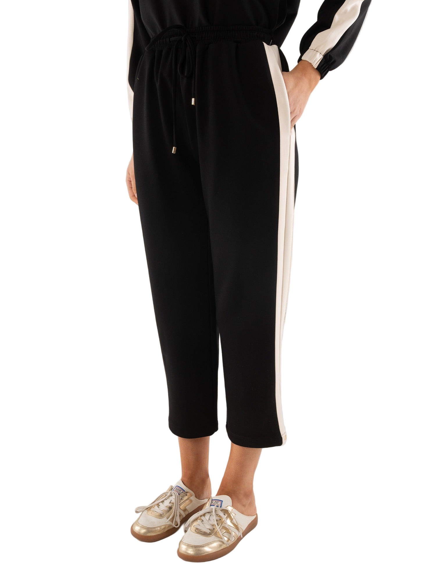 The Joy Jogger in Midnight Vanilla by Emily McCarthy redefines casual luxury with its sleek black design accented by bold ivory side stripes. Crafted with a relaxed, tapered leg and cropped hem, these joggers feature an adjustable drawstring waist for effortless comfort. Gold-tipped ties and subtle ankle zip details elevate the sporty silhouette, making them perfect for pairing with sneakers by day or heels for an athleisure-chic evening look.