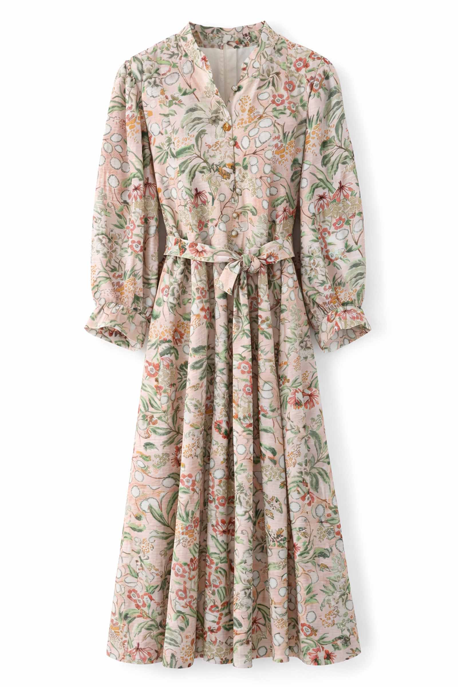 Softly romantic and effortlessly refined, the Jade Stand Collar Dress in Vintage Meadow captures timeless femininity with a modern silhouette. Featuring a delicate floral print in muted blush, sage, and warm coral tones, this graceful maxi dress evokes the charm of an English garden in bloom.