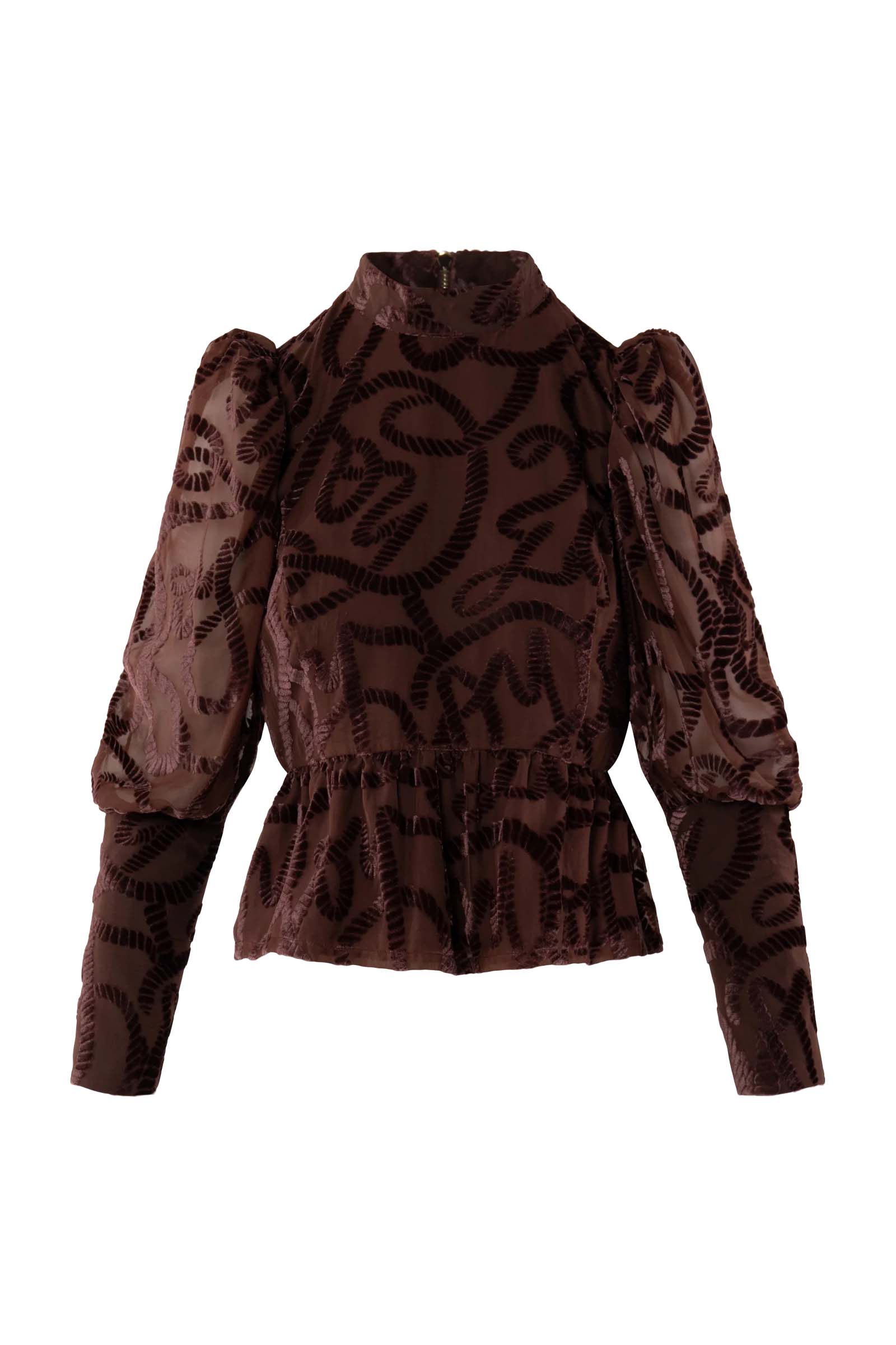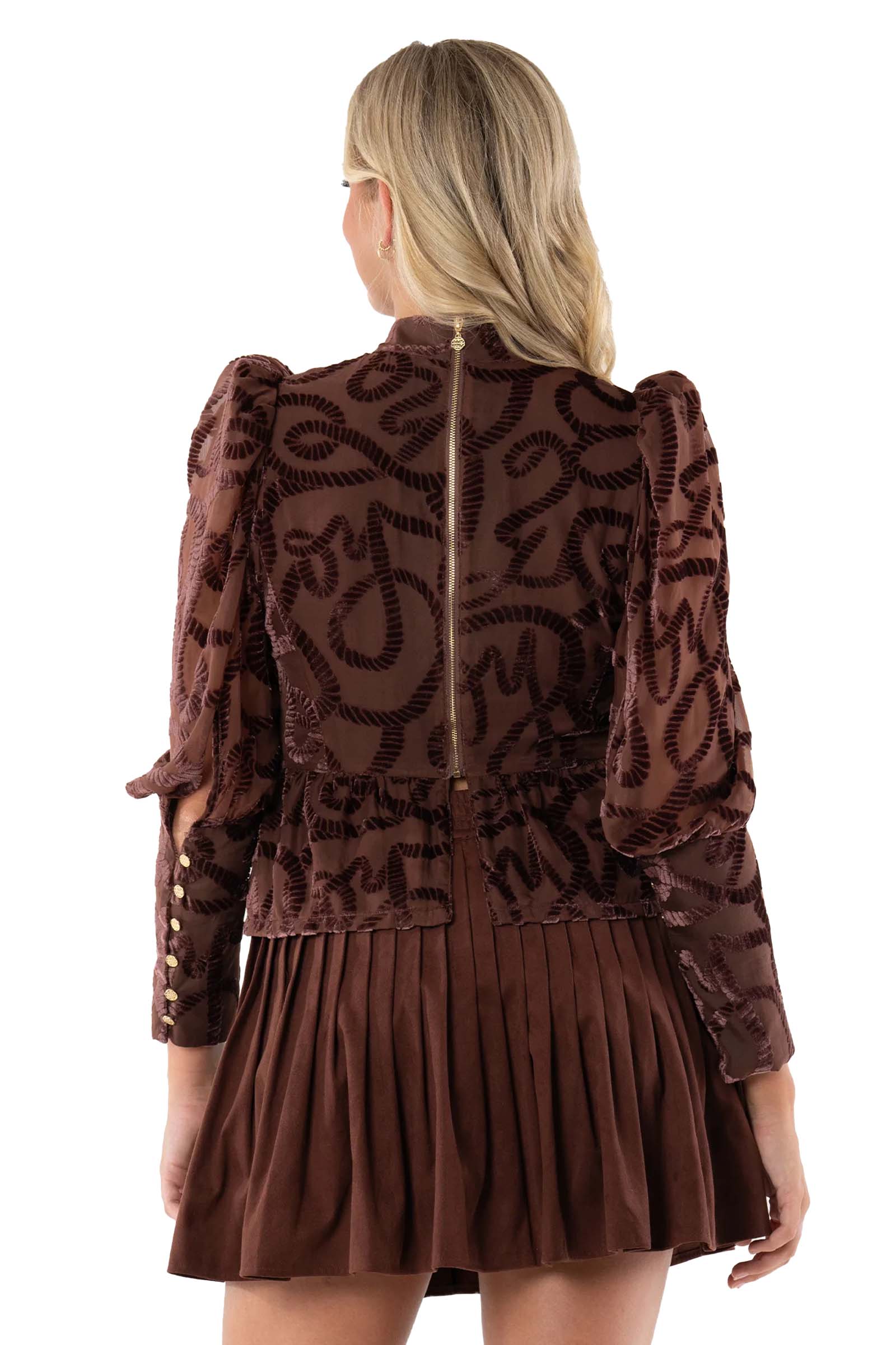 Make a statement in this sophisticated rope-colored velvet top featuring dramatic puffed sleeves and a flattering peplum hem. The unique western-inspired rope motif spelling "JOY" adds playful charm while the mock neckline and tailored fit create polished elegance. Style with dark denim and ankle boots for elevated casual chic or tuck into leather pants with statement jewelry for evening sophistication.