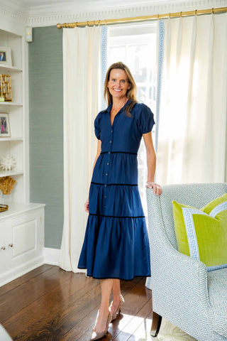 Navy Button Front Shirt Dress with Black Ric-Rac