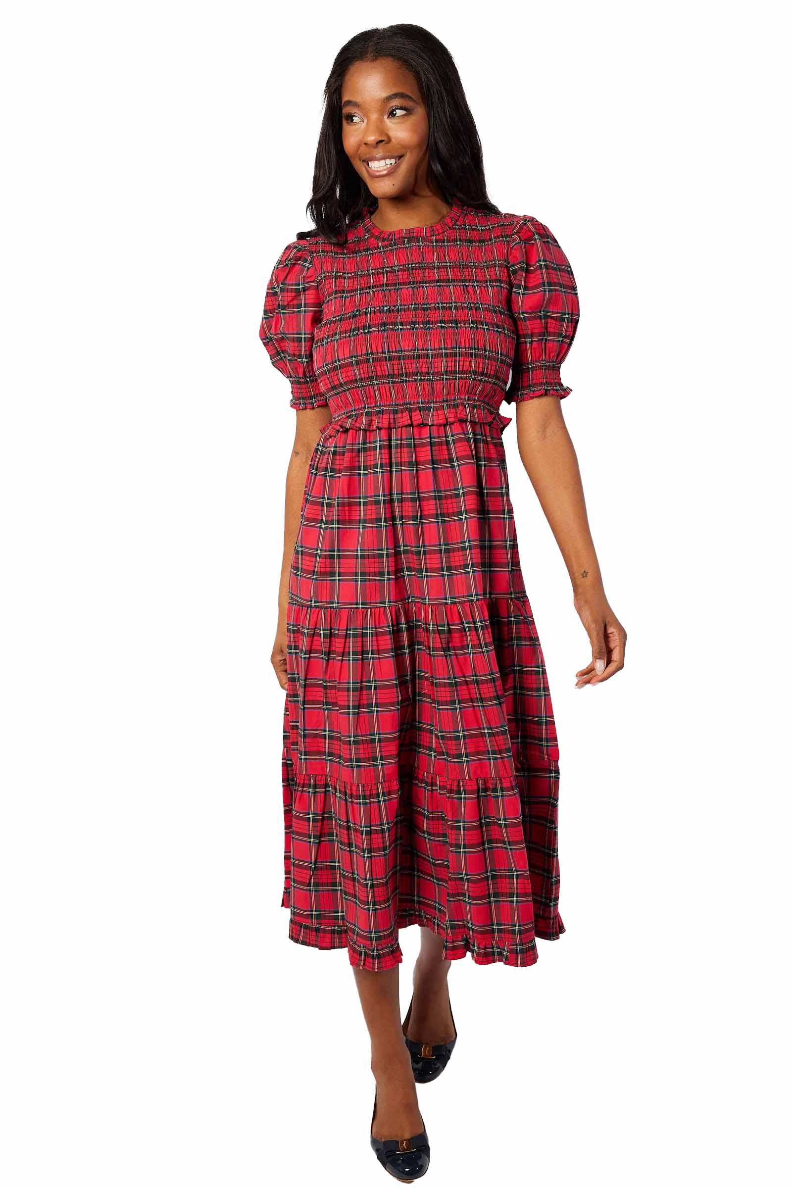 Celebrate the season in this festive tartan plaid midi dress featuring a beautifully smocked bodice that creates a flattering, feminine silhouette. The charming puff sleeves and tiered skirt add romantic movement, while the classic red plaid pattern makes it perfect for holiday gatherings, family photos, or Christmas morning traditions. Style with tall boots and a cozy cardigan for casual celebrations, or add pearl accessories and velvet pumps for an elegant holiday party look.