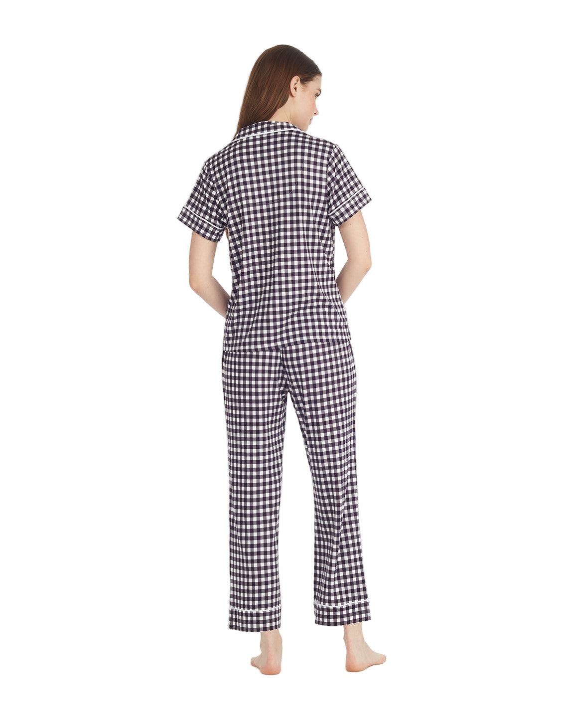 Timeless and tailored, the Linda Pajama Set by Draper James brings classic Southern charm to your sleepwear collection. Crafted from a soft, breathable fabric, this two-piece set features a navy-and-white gingham pattern with crisp white piping for a polished touch. The short-sleeve, button-front top pairs perfectly with full-length pants that have a relaxed, straight-leg fit for ultimate comfort.