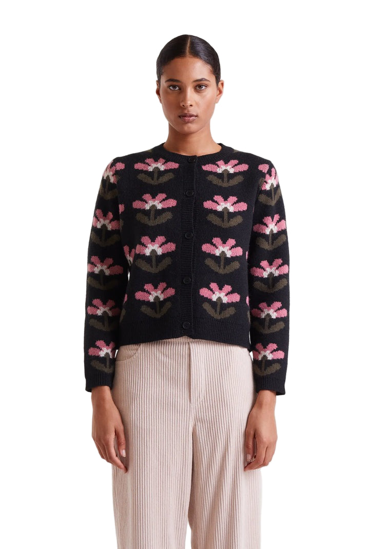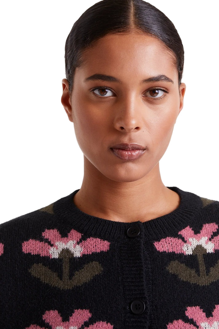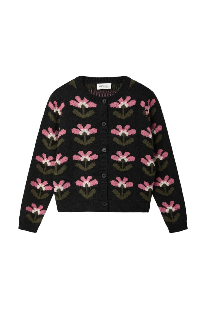 This Jacquard Cardigan by Compania Fantastica adds a cheerful, retro-inspired touch to your cool-weather wardrobe. Crafted from a soft knit fabric, it features an allover floral jacquard pattern in shades of pink, white, and olive against a black background. The classic crew neckline, button-front closure, and ribbed trims lend a timeless silhouette, while the cropped length makes it easy to style with high-waisted denim or skirts. Cozy yet playful, it’s a standout piece that brightens any day.