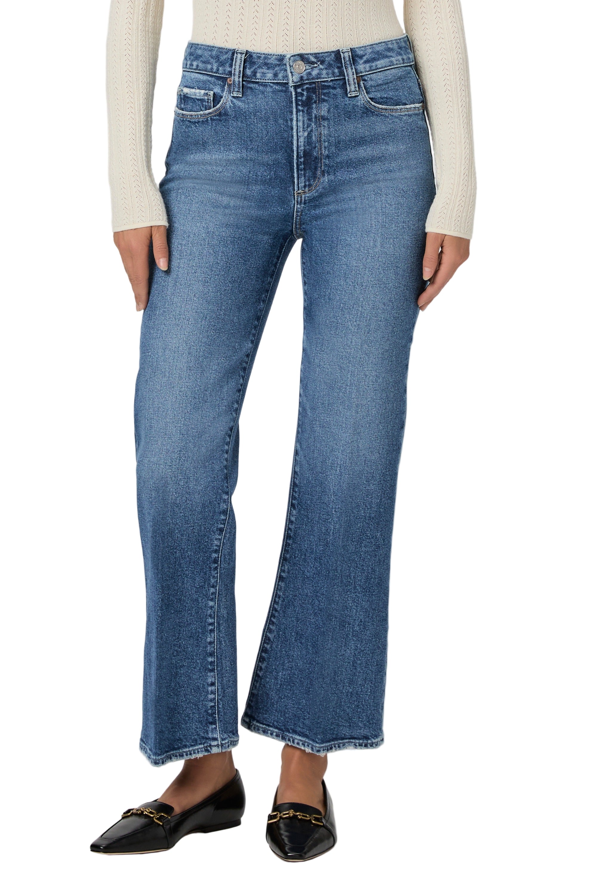 The Leenah Ankle (3/8" Finished Hem) in Rooftop by PAIGE is a stylish high-rise, straight-leg jean with a modern ankle-length cut. Crafted in PAIGE’s signature soft stretch denim, this pair features a vintage-inspired medium blue wash with subtle fading and whiskering for a naturally lived-in look. The 3/8" finished hem adds a refined detail, while the flattering silhouette elongates the legs and offers a clean, tailored finish.