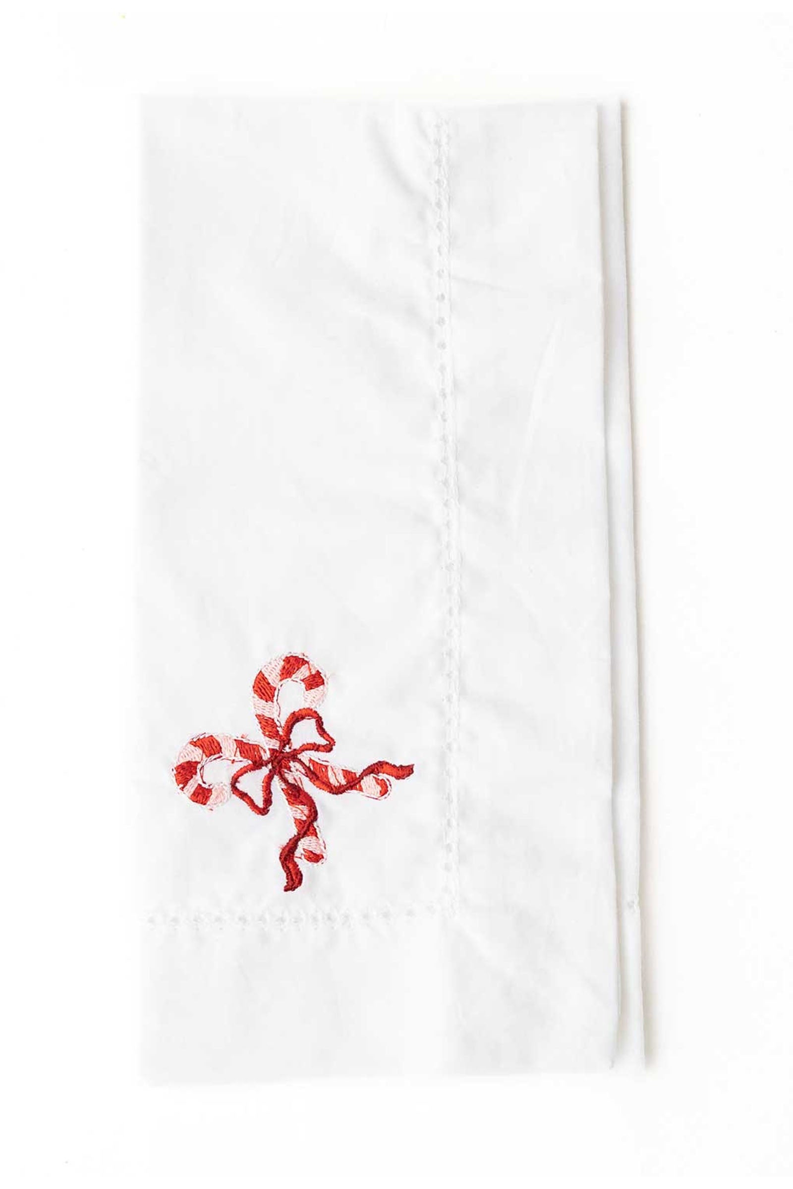 Bring festive charm and elegance to your holiday table with our Embroidered Dinner Napkins. Each napkin is crafted from crisp, high-quality white cotton and features two delicately embroidered candy canes tied with bows, creating a timeless and cheerful design that complements any seasonal table setting.  Perfect for holiday dinners, parties, or special gatherings, these napkins add a touch of whimsy and sophistication to your tabletop. Their classic embroidery pairs beautifully with both casual and formal décor, making them a versatile addition to your holiday entertaining essentials.  Durable, reusable, and thoughtfully designed, these embroidered dinner napkins elevate every meal with festive flair while providing practical functionality for everyday dining during the holiday season.