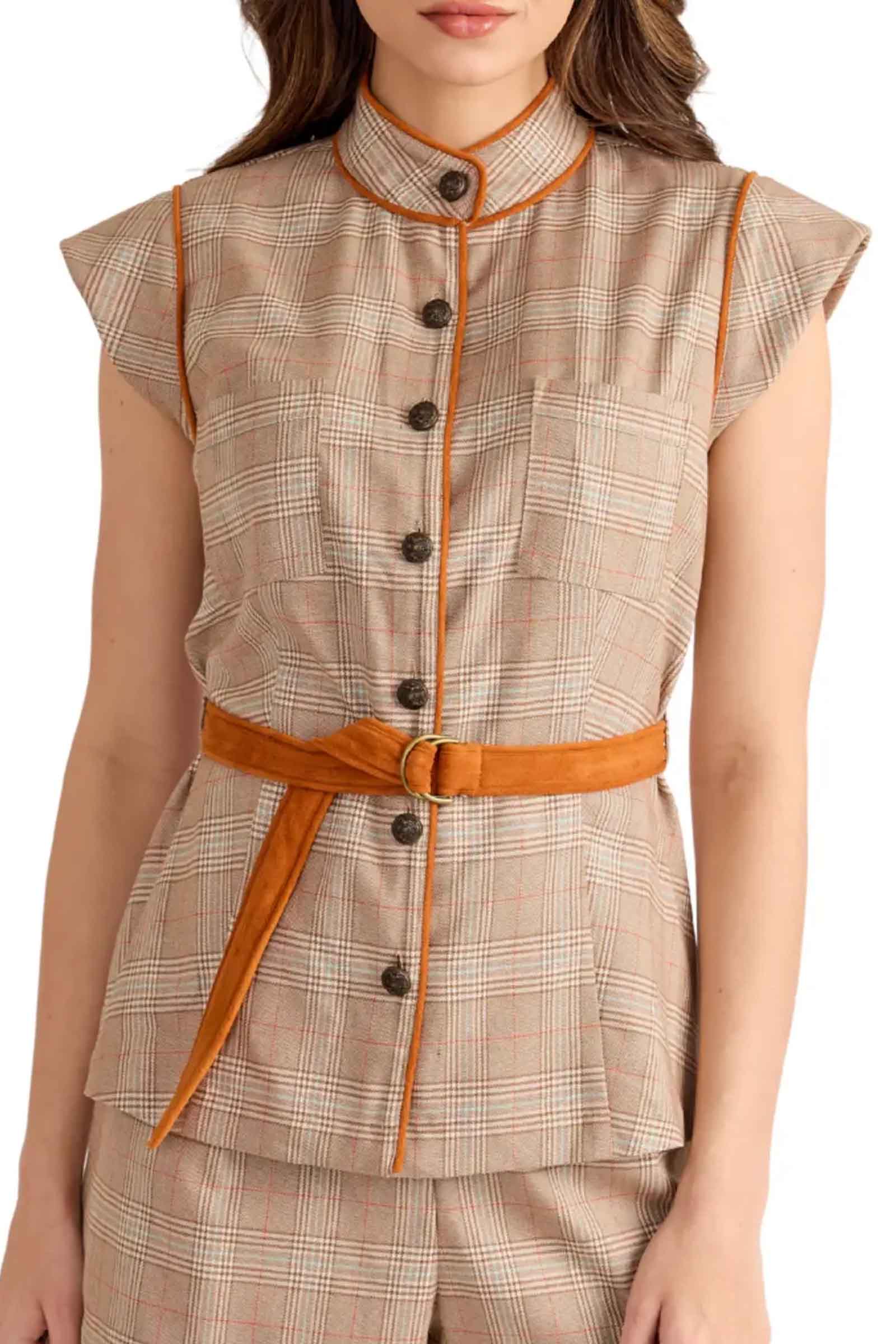 This Top features a high neck and cap sleeves. Its plaid print is accented with camel piping and belt, creating style and shape. Front buttons add subtle detail, making this top perfect to pair with skirts or denim all fall long for a polished, chic look