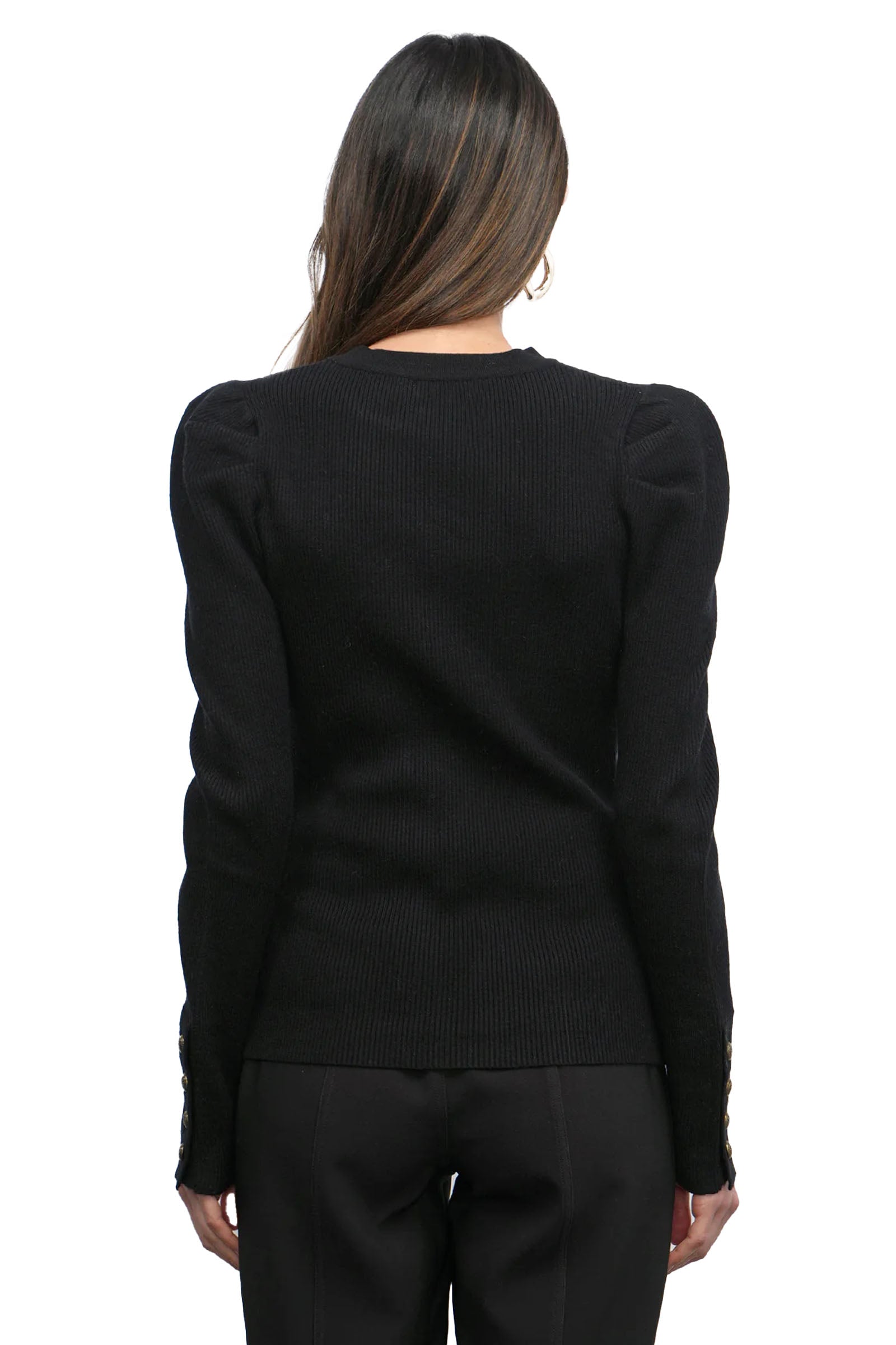 Dani Button Puff Sleeve Ribbed Knit Top - Black