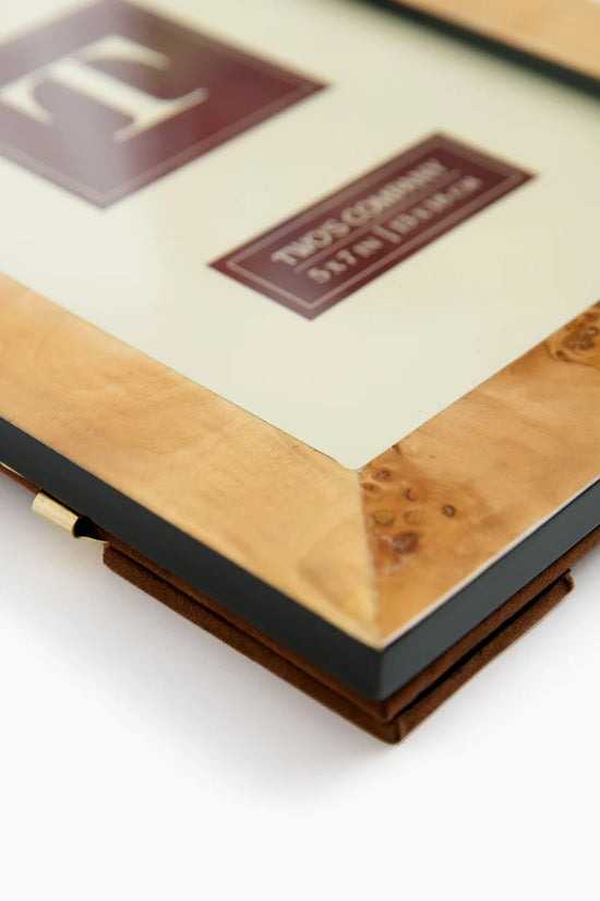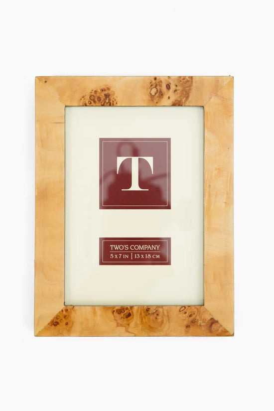 Title: Burled Wood 5x7 Photo Frame Light Brown by Two's Company Elegantly crafted by Two's Company, this Burled Wood 5x7 Photo Frame in Light Brown is a stunning addition to any home décor. Made from high-quality wood, this frame showcases a unique burled wood texture that adds a touch of sophistication. Perfect for showcasing your favorite memories, this frame fits a 5x7 photo and can be displayed horizontally or vertically. Its timeless design and neutral color make it a versatile gift option for any occasion. Give the gift of beauty and style with this giftable Burled Wood 5x7 Photo Frame in Light Brown.
