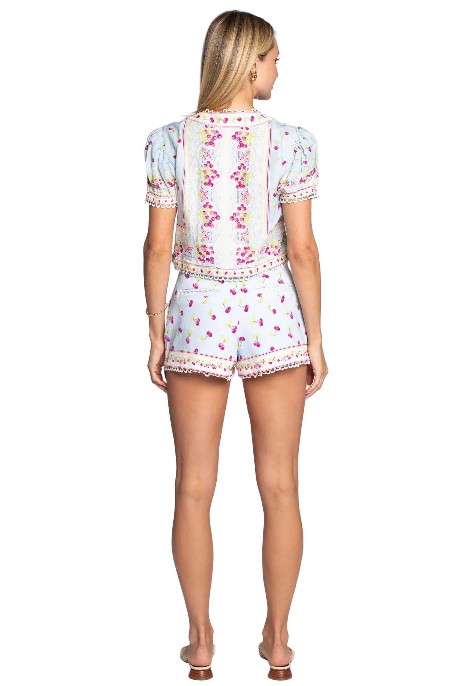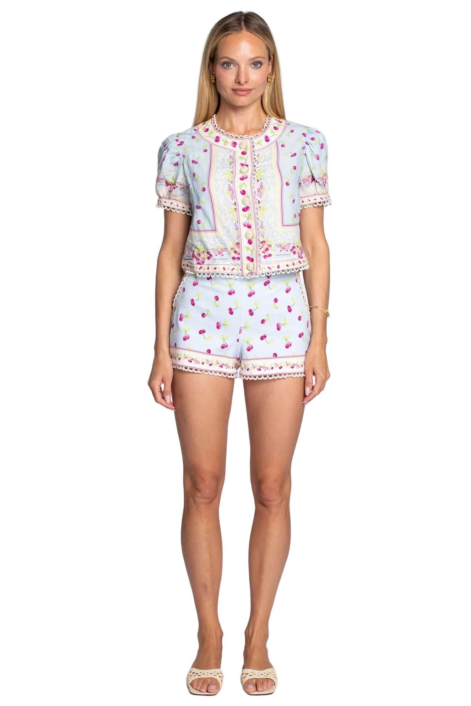 The Coco Top in Cherries by Elizabeth James The Label is the sweetest statement piece for spring—equal parts polished and playful, with charming details that make it feel extra special. Featuring a soft blue base scattered with a delicate cherry print, this darling silhouette blends vintage-inspired femininity with everyday versatility.