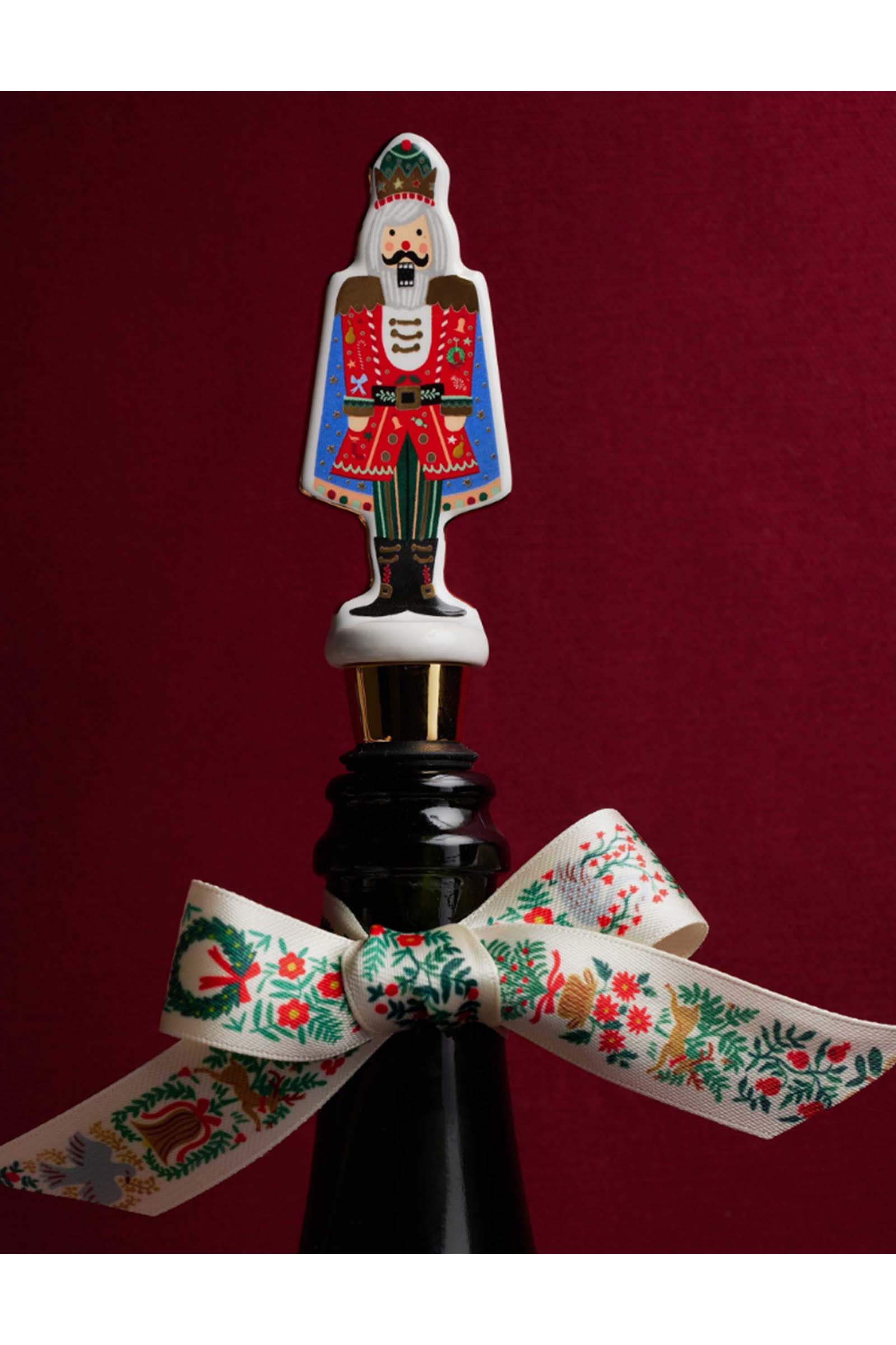 Add festive charm to your holiday entertaining with this whimsical wine stopper set featuring a classic nutcracker soldier and decorated Christmas tree designed by Rifle Paper Co. The hand-painted enamel toppers with gleaming gold accents transform ordinary wine bottles into cheerful holiday décor perfect for parties or display. This delightful duo makes an ideal hostess gift, stocking stuffer, or addition to your own seasonal bar cart that brings joy to every pour.