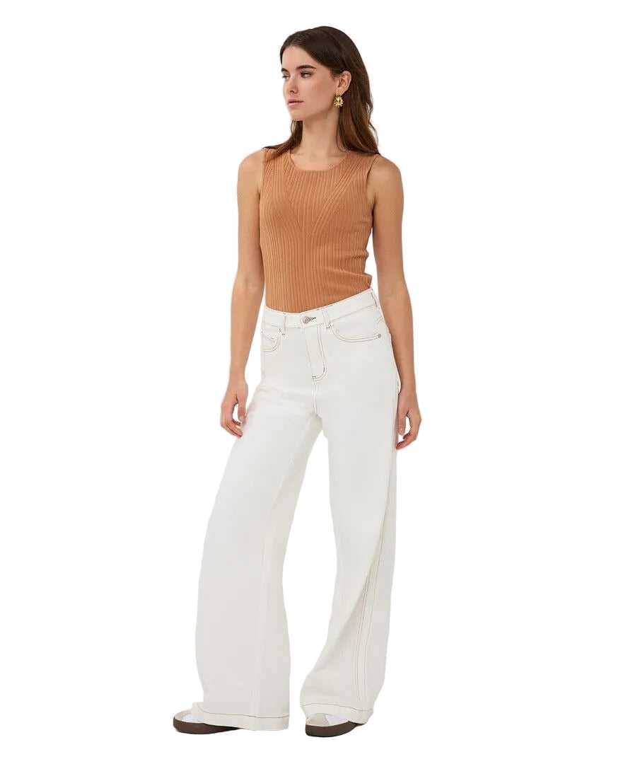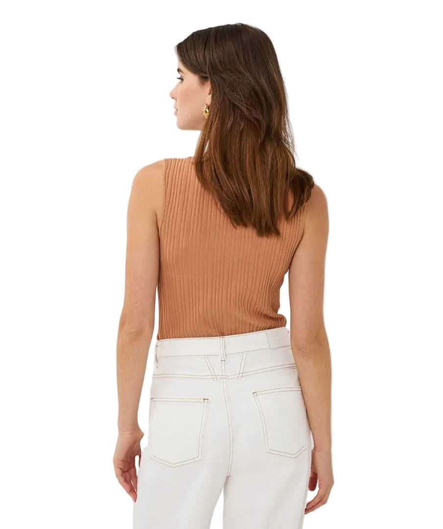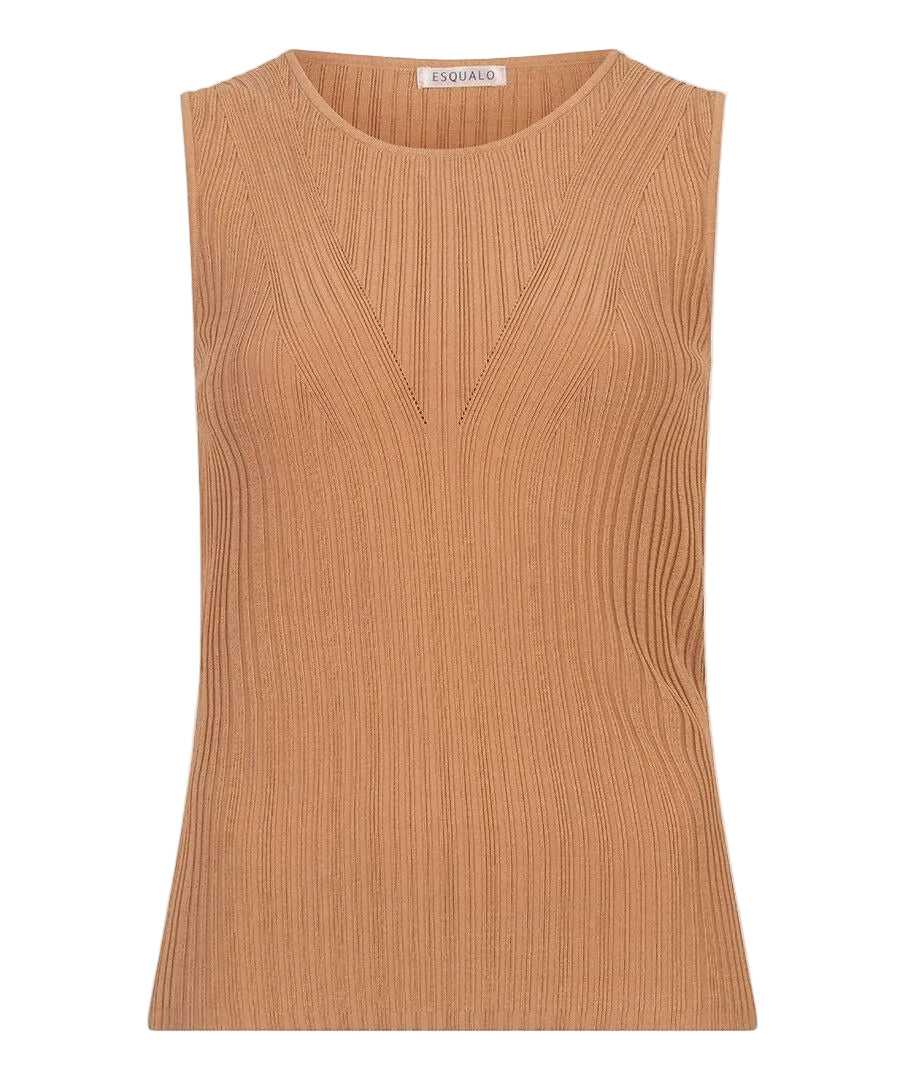 Effortlessly polished and endlessly versatile, this sleeveless rib-knit top by EsQualo is a refined wardrobe essential. The soft cappuccino hue pairs beautifully with everything from crisp white denim to tailored trousers, while the subtle V-shaped rib detailing adds texture and a flattering silhouette. Lightweight with a comfortable stretch, it’s perfect worn alone or layered for a clean, sophisticated look.