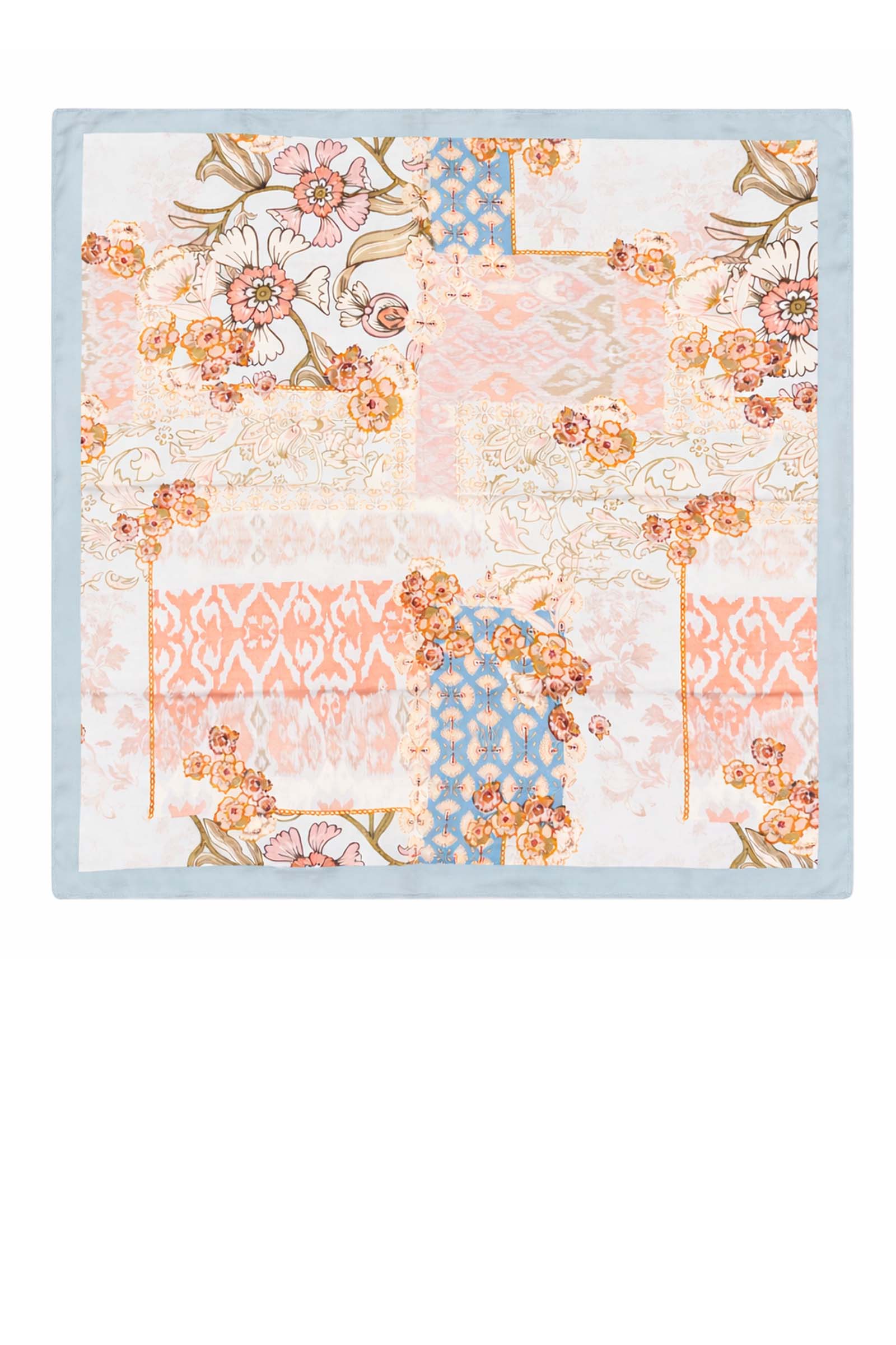 Add a soft, feminine finish to any look with this beautifully detailed Virtue square scarf. Designed in a delicate blend of blush florals, soft blues, and subtle pattern mixing, this piece brings an elevated yet effortless feel to your everyday styling.